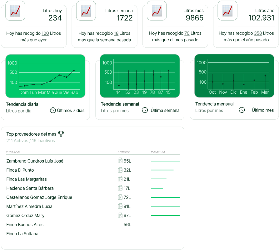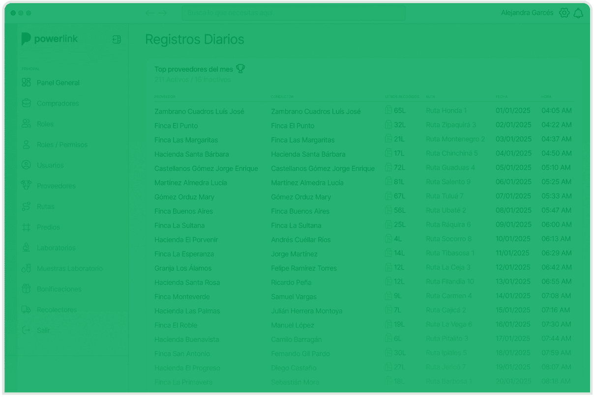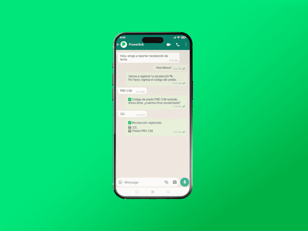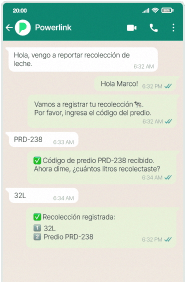 Desde la finca hasta tu planta, cada litro queda registrado de forma automática. Tus conductores reportan vía WhatsApp y Powerlink organiza, liquida según resolución 000017 y genera reportes requeridos por MinAgricultura al instante.